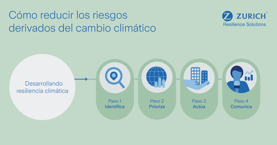 Los efectos del cambio climático se dejan sentir en las empresas de todo el mundo. Tomar medidas para mitigar el impacto sobre el clima es vital, pero también tiene sentido desde el punto de vista financiero. Actuando ahora, las empresas pueden reducir los riesgos derivados del cambio climático, e incluso aprovechar las nuevas oportunidades de un futuro más ecológico. Zurich Resilience Solutions acompaña a las empresas e instituciones en su resiliencia climática, ya que las empresas que identifiquen y actúen ahora frente a los riesgos climáticos lograrán ser más fuertes en el futuro.